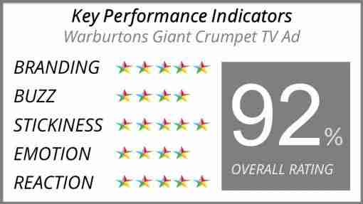 AdProbe measures the overall performance of advertising on the 5 key metrics: Branding, Buzz, Stickiness, Emotion and Reaction. These metrics are proven to drivers of advertising effectiveness. The table (left) highlights the Warburton’s advertising achieving a whopping 92% with 4* and 5* on every measures. On an emotional level (See Vision One’s Emotional Intensity Index), this advertising primarily pulls on the PASSION trigger through it’s amusing and irresistible antics. It also performs well on our CHALLENGE and PRESTIGE triggers which means it is seen as Creative, Original, Surprising and superior to other adverts.